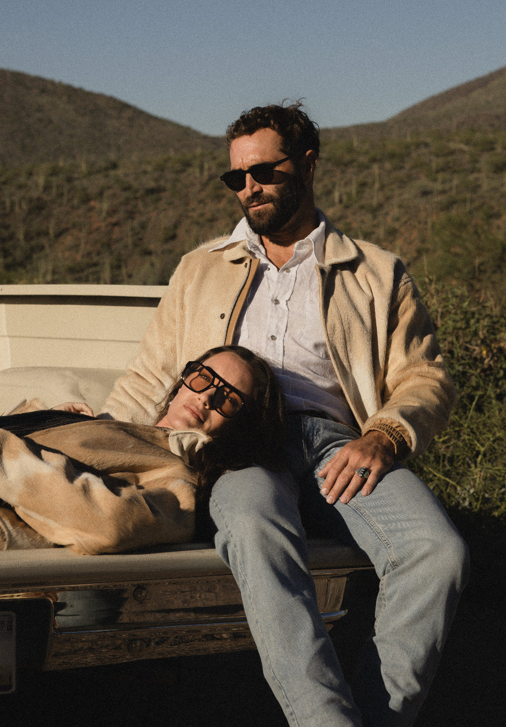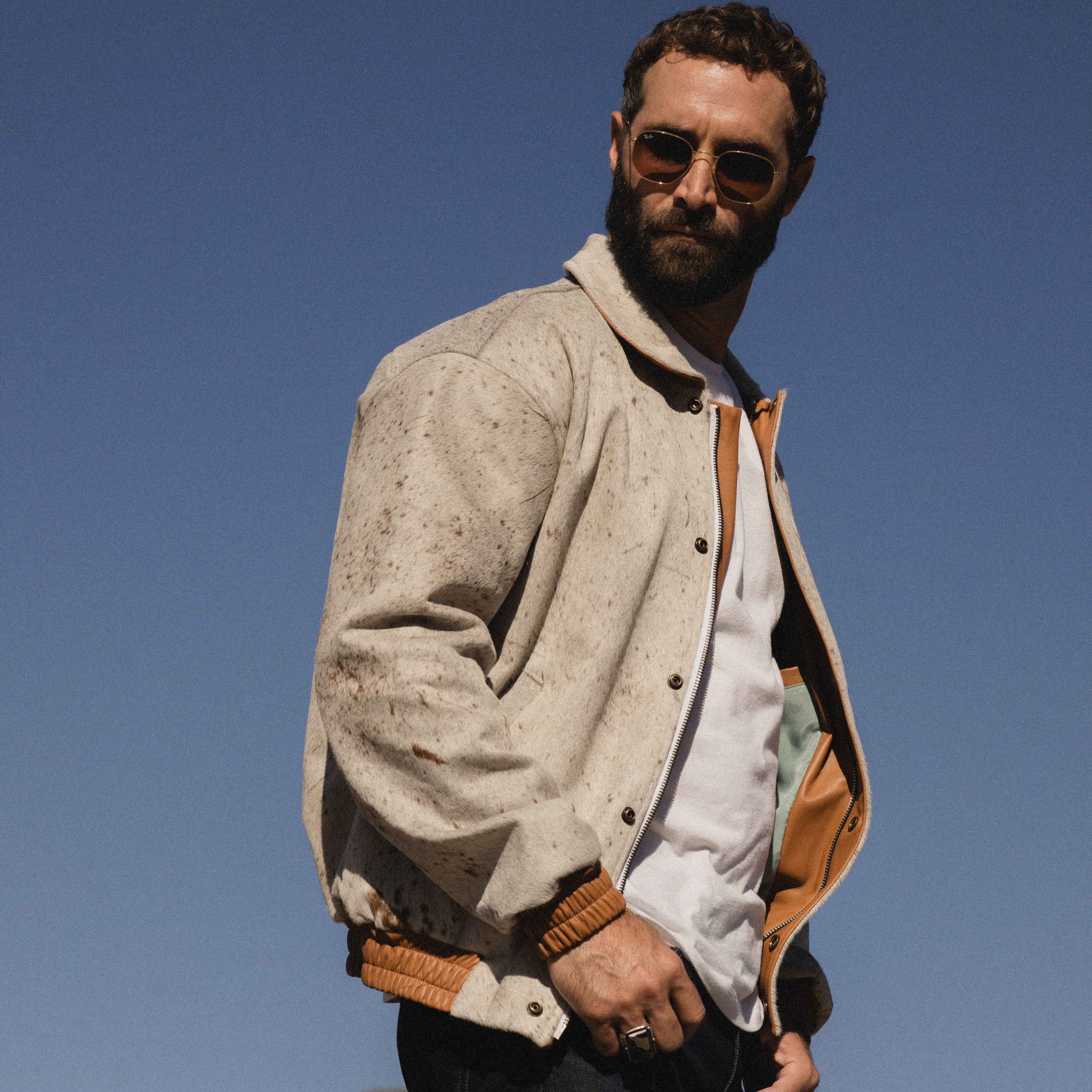 Calm in tone, wild in origin. The Mescalero is a bomber jacket crafted from beige-and-white pinto cowhide. It’s lined in bone-colored Japanese cupro and finished with camel lambskin trim.