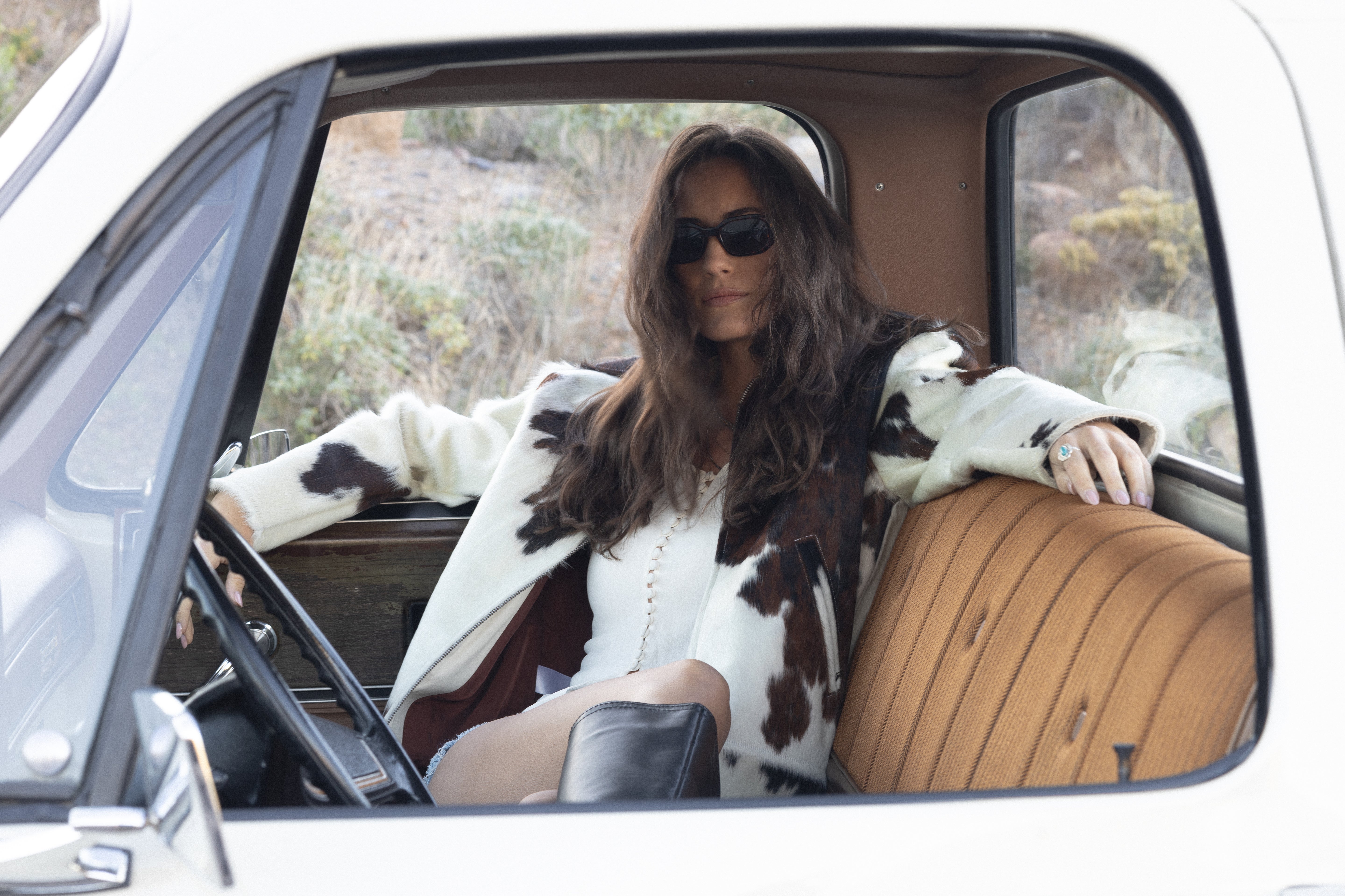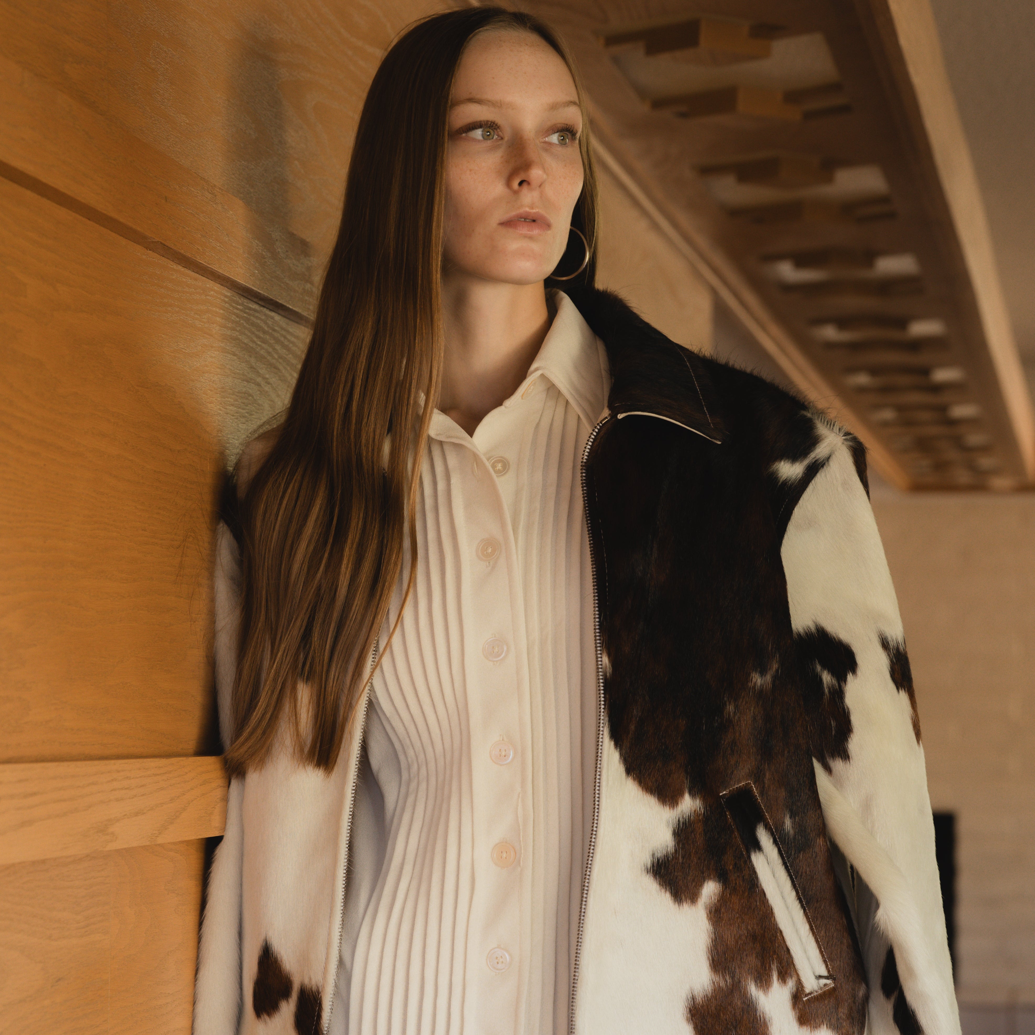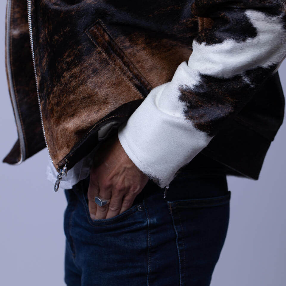 Calm in tone, wild in origin. The Mescalero is a bomber jacket crafted from beige-and-white pinto cowhide. It’s lined in bone-colored Japanese cupro and finished with camel lambskin trim.